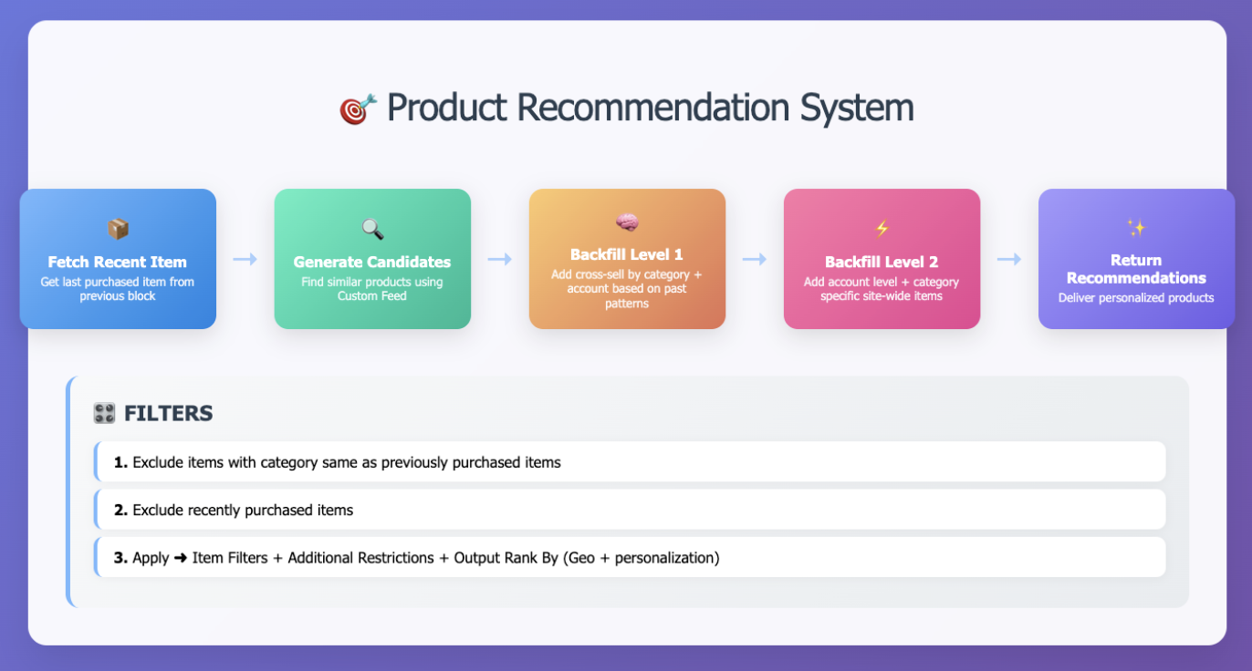 Each post-purchase journey starts with the customer’s most recent purchase as the anchor. Products from the same category level as that purchase are automatically filtered out to avoid redundancy, opening space for complementary cross-category suggestions that encourage broader discovery.